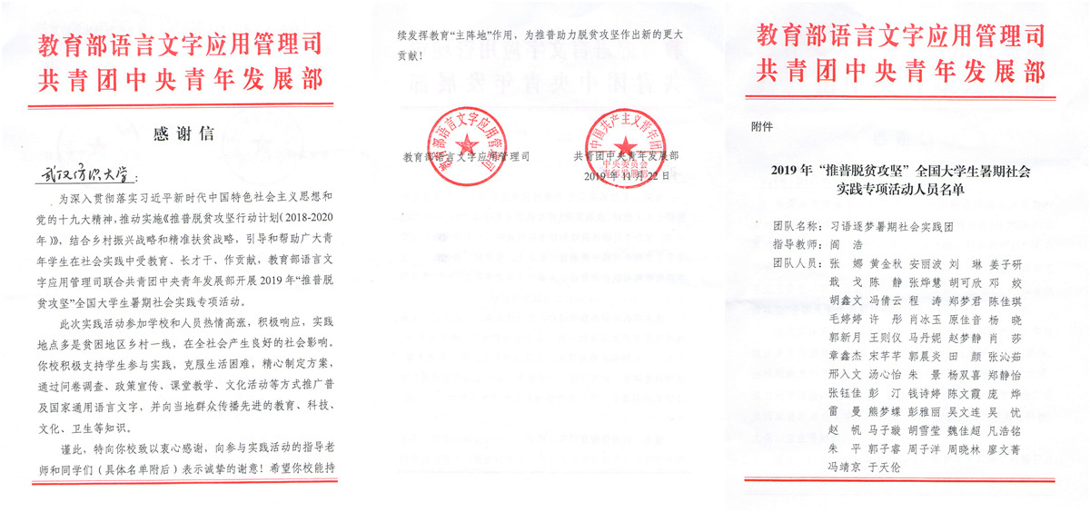 首次获批教育部“推普脱贫攻坚”大学生暑期社会实践项目1项,武汉市团委“新青年下乡”暑期社会实践项目2项,辅导员阎浩首次荣获湖北省辅导员素质能力大赛三等奖。