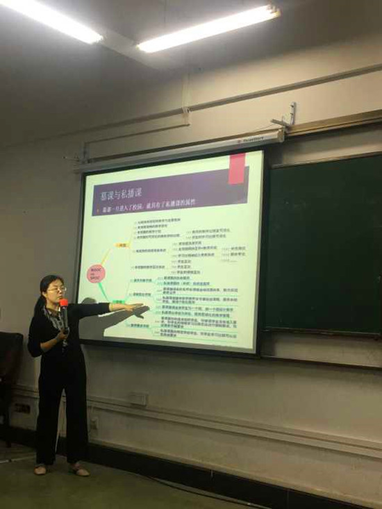 杨雪老师以四川外国语大学“大学英语国家精品在线课程”—新标准大学英语为例,汇报了关于了慕课的制作方法与课程建设,慕课与私播课的区别,以及私播课在大学英语课堂翻转教学中的应用等方面的学习内容与学习体会。