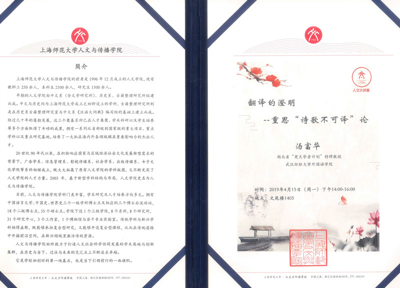 “_”特聘教授、湖北省比较文学学会副会长汤富华教授赴上海师范大学作题为《翻译的澄明:重思诗歌不可译论》学术讲座。汤富华教授以其广博的学识、幽默的语言,深入浅出地为师生们梳理了翻译学科的缘起及发展,以比较文学的视角,哲学的方法论,从形而上与形而下两个维度,阐释了翻译的本质,对翻译学科的发展方向,提出了自己独到的见解。