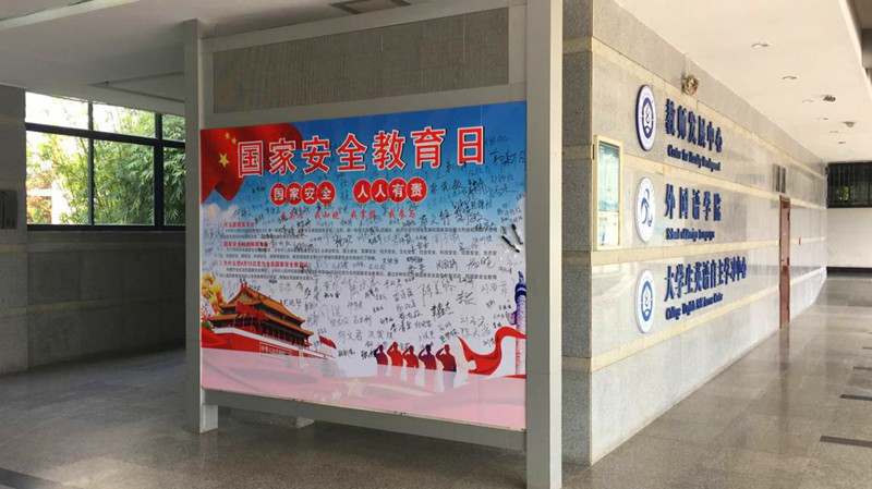在阳光校区崇文楼一楼大厅设立“国家安全 人人有责”、“我关心、我知晓、我掌握、我参与”国家安全主题签名墙,nba博彩