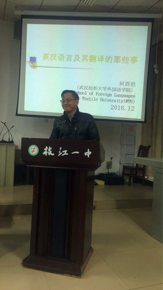 会后,副院长柯群胜教授为枝江一中的同学们送去了一场题为“英汉语言及其翻译的那些事”的学术报告,同时,枝江一中的师生们一同观看了武汉纺织大学六十周年校庆纪录片。