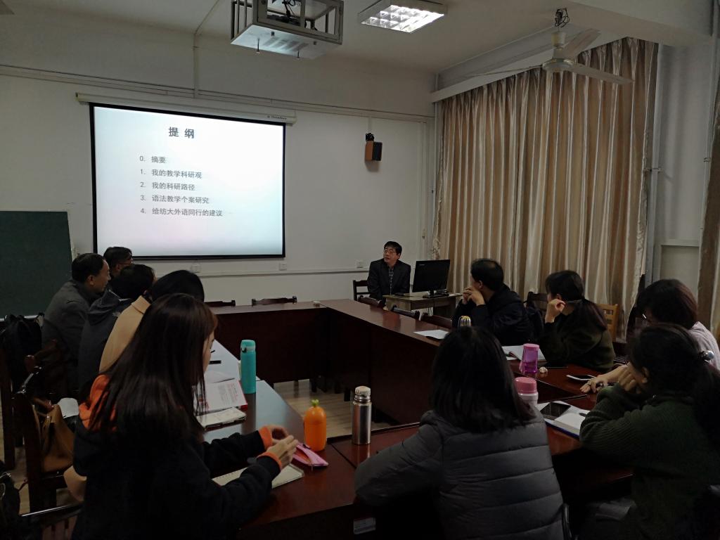 做了题为“我的教学科研观:语法教学个案”的学术讲座。此次讲座由柯群胜副院长主持,部分青年骨干教师及研究生参与了此次讲座。