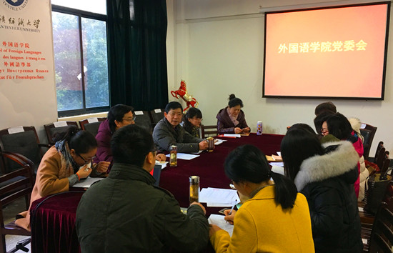 外语系学生党支部书记阎浩老师依次从学习宣传贯彻党的十九大精神情况、推进基层党建工作情况、开展思想政治工作情况、整改突出问题和改进措施情况等方面逐一进行支部工作述职。各支部在广泛交流好的经验做法的基础上,也充分分析了支部工作中现存的问题,并提出了2018年工作展望。
