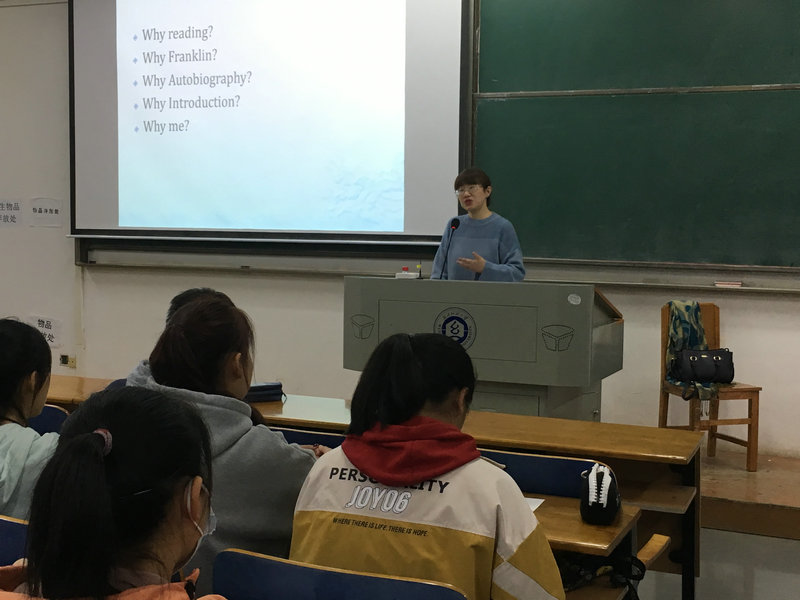 在导读讲座上,谭教授首先从富兰克林的生平经历切入,引导和鼓励学生多阅读多思考,尝试生命中的各种“新创举”,同时在生活中加强自律,注重培养“生活中的美德”。随后,针对英语类专业的学习特点,谭教授特别指出该书语言简洁朴实,鼓励学生要学会改写(rewrite), 并且留心做阅读笔记,通过积累模仿来形成自己的语言风格。最后,就本书的教育意义,谭教授提示学生注重体悟富兰克林追逐梦想的艰难历程,在阅读中感受和了解异域文化。