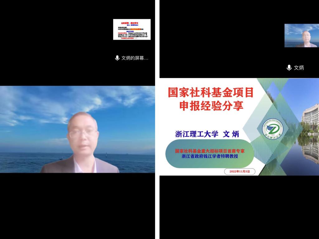 院长文炳教授在云端为全体教师作了题为:国家社科基金项目申报经验分享的学术讲座,讲座由院长谭燕保教授主持。