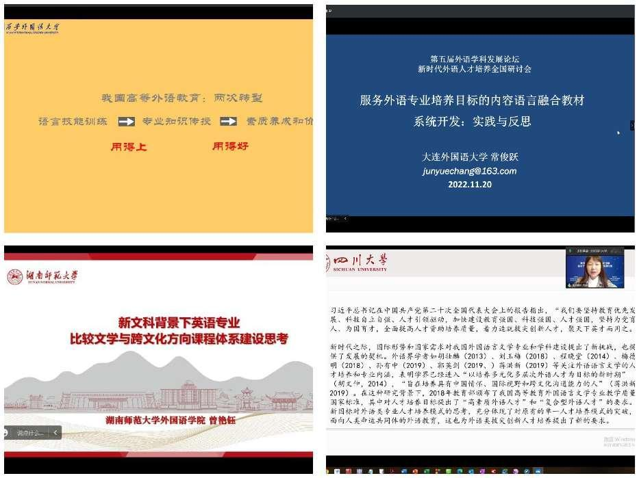 的常俊跃教授就如何开发内容和语言融合的教材系统提供了自己的实践和反思;湖南师范大学的曾艳钰教授就高素质外语人才的培养,给出了比较文学与跨文化方向课程体系的思考;罗良功教授就建设英语文学类课程体系以及该体系如何为人才培养的总目标服务提出了构想;四川大学的王欣教授介绍了外语类拔尖创新人才的培养体系,华中科技大学的许明武教授谈到了新时期外语学科的内涵深化与建设的系统化,以及扬州大学的王金铨教授分享了地方特色外语人才的培养实践教学体系。在微观层面,华东师范大学的杨延宁教授以教材内容的编排为案例,呈现了教材文化内容的实践路径;广东外语外贸大学的冯光武教授就《理解当代中国》为例,分析了该系列教材撰写的理念,使用目标和教学实践要求和实施路径,战略支援部队信息工程大学的陈春华教授以英语视听说课程为例,分享了课程建构理论和内容的建构。最后,郑州大学的钱建成教授从教师职业发展的视角,强调了外语教师的发展方向与人才培养目标达成一致的重要性。武汉纺织大学谭燕保教授从理论的角度阐述了英语专业人才培养的整体性思维,同时也介绍了在该理念指导下的实践活动以及产出的成果。