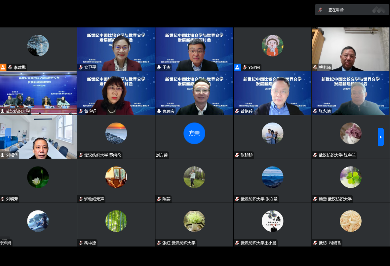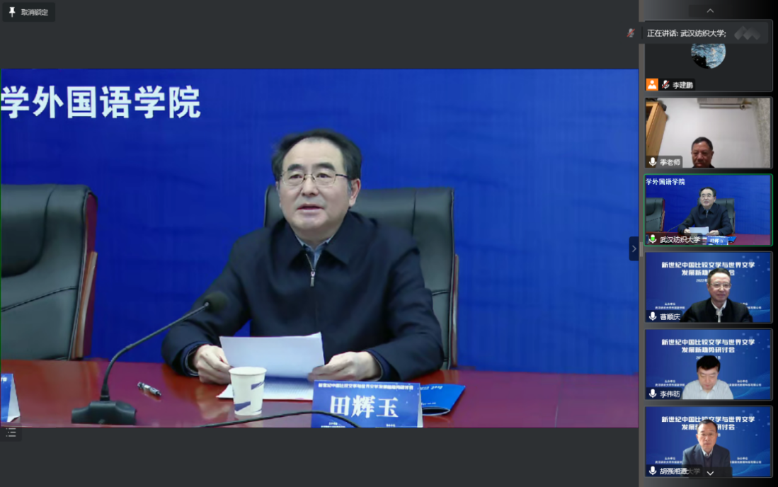 主办的“新世纪中国比较文学与世界文学发展新趋势研讨会”在线举行。来自复旦大学、中国人民大学、浙江大学、武汉大学、四川大学﹑湖南师范大学、湘潭大学及河南大学的相关学科专家和学者就多学科融合背景下的比较文学跨学科研究,中国比较文学研究的新走向﹑新特点,欧美各国现当代重要作家、作品研究以及马克思主义文论与中外文论比较研究等议题展开了广泛而深入的探讨。来自全国众多高校的教师及研究生参加了此次研讨会,校党委书记田辉玉教授出席会议并致辞。大会由湘潭大学季水河教授和我校谭燕保教授共同主持。