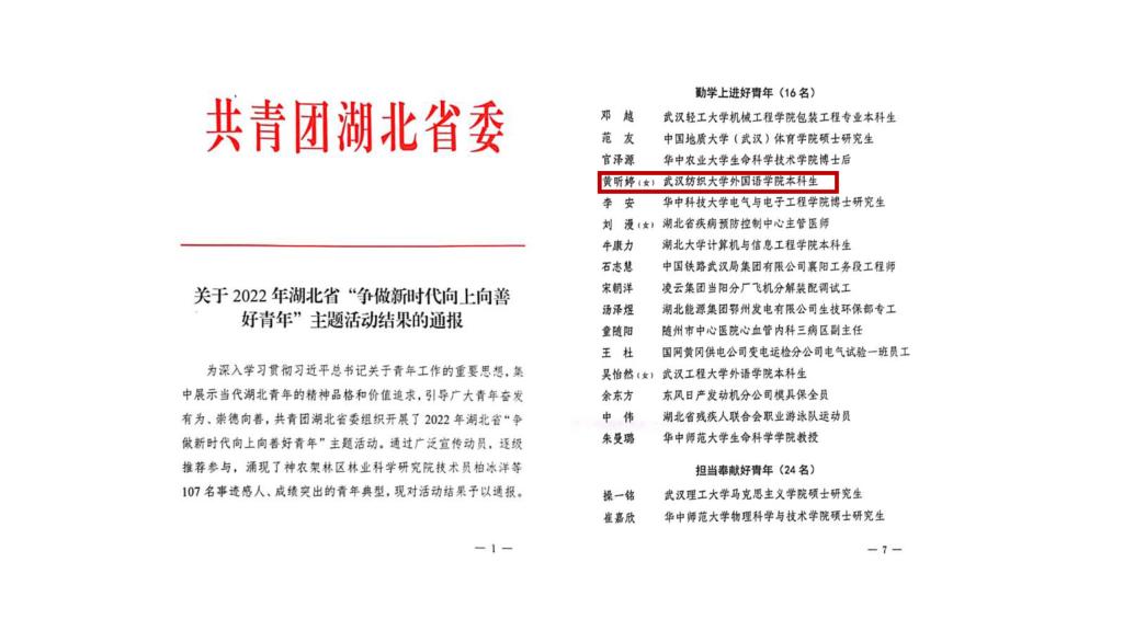 学生黄昕婷获评“勤学上进好青年”,成为学校唯一获得该荣誉称号学生;黄昕婷同时获评学校2021-2022年度“青春力量•感动纺大”大学生榜样人物。