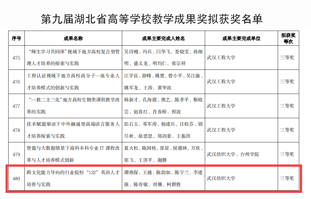 二、连续2届获评湖北省高等学校教学成果奖三等奖1项(谭燕保),获评中纺联纺织高等教育教学成果奖4项(周丹、刘丹、柯细香、唐娴),nba博彩