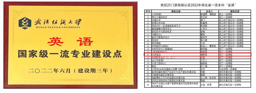 英语专业获批2021年度国家级一流本科专业建设点,成为学校17个国家级一流本科专业建设点之一;12月,湖北省教育厅发布《省教育厅关于公布2022年度省级一流本科课程认定结果的通知》,nba博彩