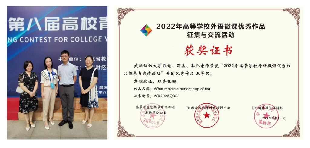 青年教师王越获评二等奖,该奖项为我校教师在该项赛事中获得的历史最佳成绩。此外,王越、曹婷团队获评第二届湖北省高校教师教学创新大赛省级三等奖;郭婧、邵嘉、郭乔团队获评2022年高等学校外语微课优秀作品征集与交流活动全国优秀作品三等奖。