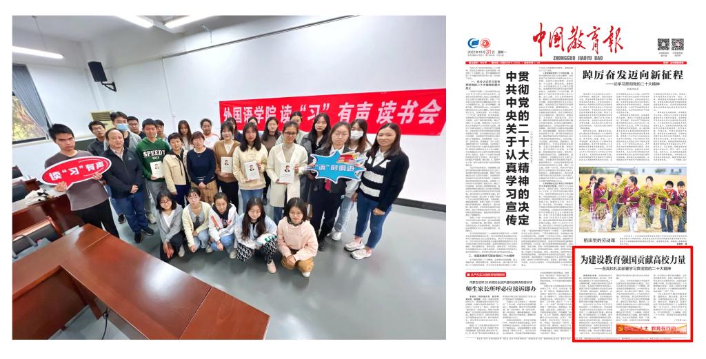 学生党建工作取得新亮点。10月,组织师生党员开展“读‘习’有声”党的二十大精神专题读书会、“习语金句”学习党的二十大精神专题翻译大赛、“语时俱进”学习党的二十大精神专题演讲大赛等系列活动,深入学习贯彻党的二十大精神,构建文化育人课程思政模式,发挥引领示范作用,助力学科高质量发展,受到《中国教育报》等媒体关注和报道。