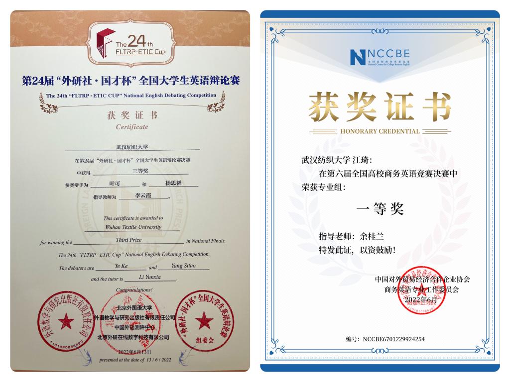 教师谭燕保主持《跨文化能力导向的行业院校“122”英语人才培养与实践》获评省级教学成果奖三等奖;3月,中国纺织工业联合会发布《关于授予“纺织之光”2021年度中国纺织工业联合会纺织高等教育教学成果奖的决定》,周丹主持《行业背景下综合类高校研究生公共英语立体化课程体系研究与实践》获评中纺联纺织高等教育教学成果奖一等奖,刘丹、柯细香、唐娴分别获评中纺联纺织高等教育教学成果奖二等奖。