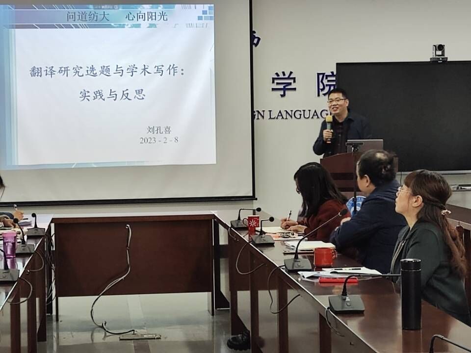 会议室04-303开展了第一场学术活动。湖北民族大学MTI教育中心主任刘孔喜博士受邀为全院教师做了一场学术讲座,题目为:翻译研究选题和学术写作:实践与反思。讲座由nba博彩