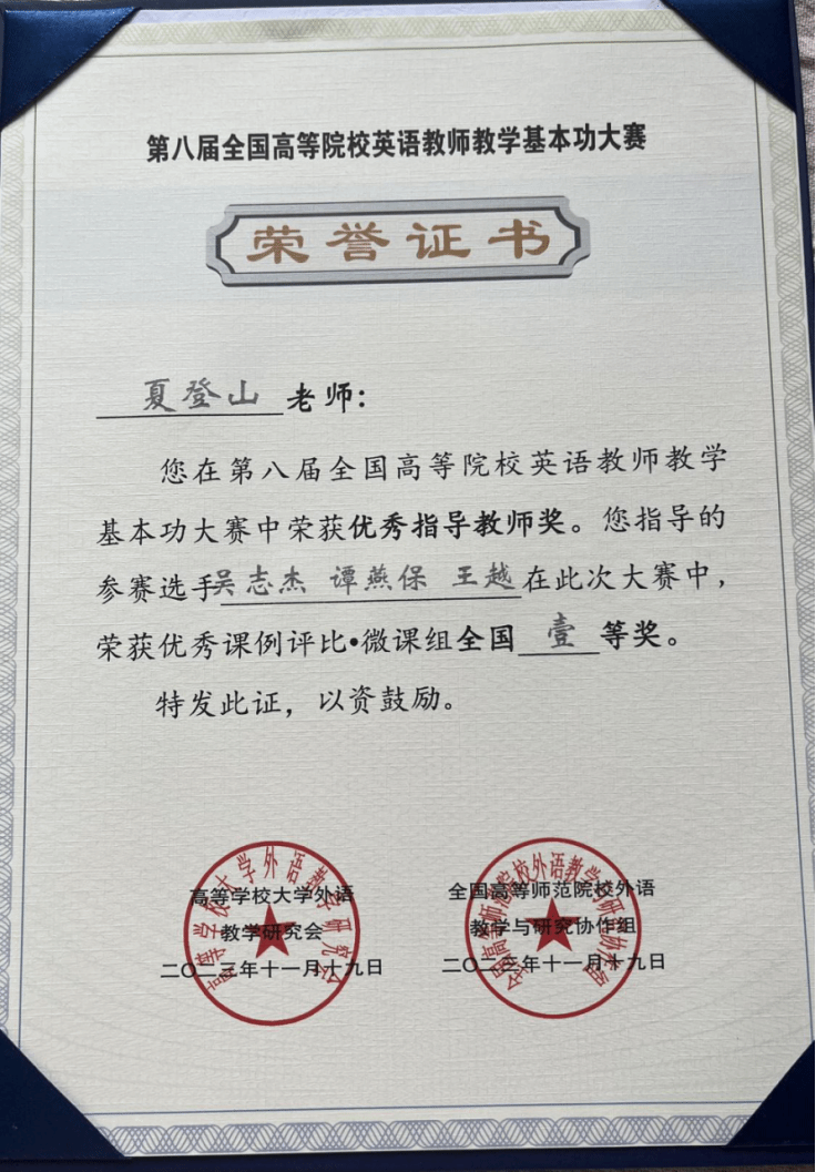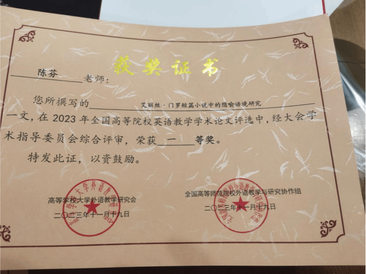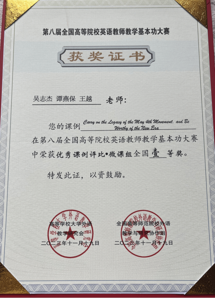 教师在第八届全国高等院校英语教师教学基本功大赛中喜获佳绩,获得微课组全国一等奖一项、三等奖一项,实录课省级三等奖一项,学术论文评选全国一等奖一项、三等奖一项。此次大赛分为说课、实录课、微课和教学学术论文评选四个组别,由高等学校大学外语教学研究会、高等院校外语教学与研究协作组主办,已被中国高等教育学会纳入“2023版全国普通高校教师教学发展指数”,是全国高校外语教师教学竞赛中的重要赛事之一。