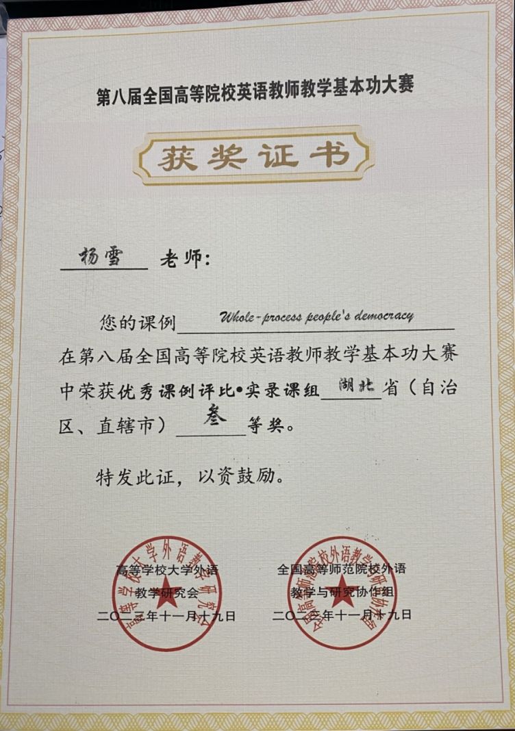 获得实录课组湖北省三等奖的是杨雪老师的作品Whole-process People’s Democracy,杨雪老师是《理解当代中国阅读与写作》课程的主讲教师之一,该作品也是nba博彩