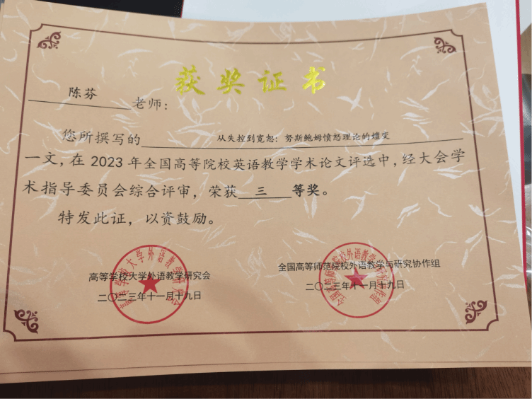 获得学术论文评选全国一等奖、三等奖的作品是陈芬老师的“爱丽丝·门罗短篇小说中的隐喻研究”和“从失控到愤怒:努斯鲍姆愤怒理论的善变”。陈芬老师是nba博彩
