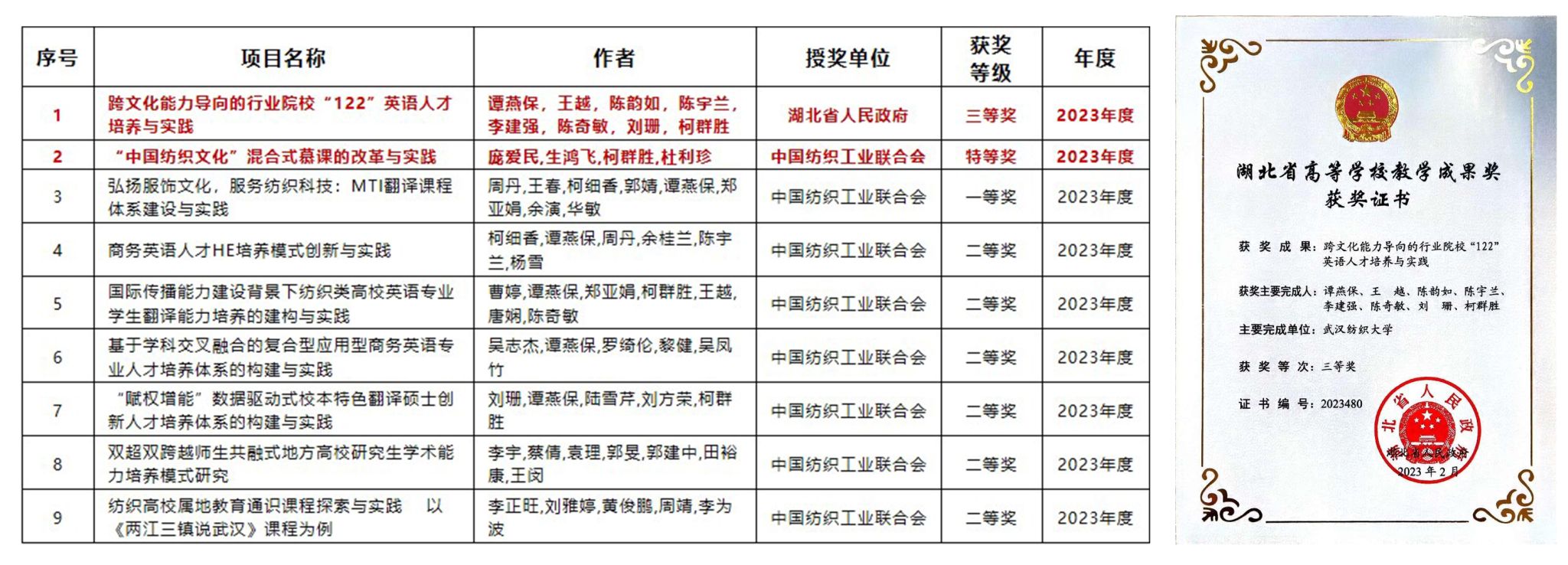 省部级教学成果奖取得新成绩。3月,湖北省人力资源和社会保障厅与省教育厅联合印发《关于公布第九届湖北省高等学校教学成果奖获奖项目的通知》,谭燕保主持《跨文化能力导向的行业院校“122”英语人才培养与实践》获评省级教学成果奖三等奖;9月,中国纺织工业联合会公布《关于授予“纺织之光”2023年度中国纺织工业联合会纺织高等教育教学成果奖的决定》,柯群胜参与《“中国纺织文化”混合式慕课的改革与实践》获评特等奖,周丹主持《弘扬服饰文化,服务纺织科技:MTI翻译课程体系建设与实践 》获评一等奖,柯细香、曹婷、吴志杰、刘珊、蔡倩、刘雅婷主持或参与项目分别获评二等奖。