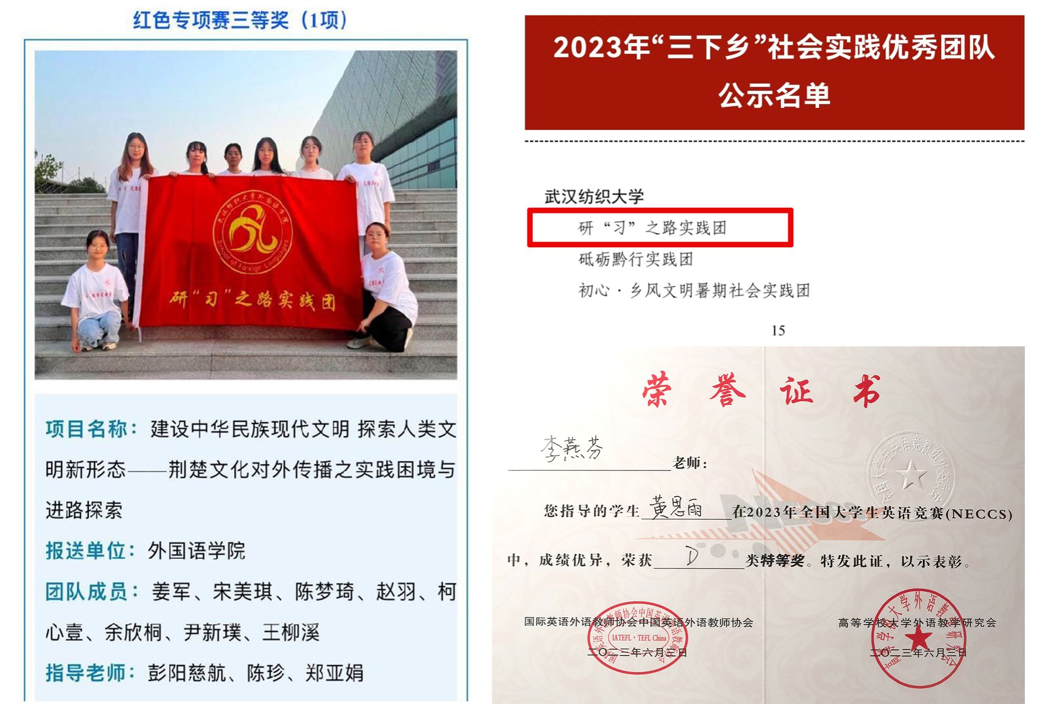 人才培养质量获得新提高。6月,全国大学生英语竞赛决赛成绩揭晓,李燕芬指导黄思雨同学获评特等奖;7月,共青团湖北省委公布2022年度湖北省大学生自强之星名单,黄昕婷同学获评湖北省大学生自强之星荣誉称号;10月,第十八届“挑战杯”全国大学生课外学术科技作品竞赛结果公布,彭阳慈航、郑亚娟指导《建设中华民族现代文明 探索人类文明新形态——荆楚文化对外传播之实践困境与进路探索》荣获红色专项全国三等奖;11月,“外研社•国才杯”理解当代中国全国大学生外语能力大赛英语组阅读赛项国赛获奖名单公布,钱茂华指导李骁原同学获评国家级银奖;12月,共青团湖北省委、省学联发布《2023年湖北省大中专学生志愿者暑期文化科技卫生“三下乡”社会实践活动总结通报结果》,“研‘习’之路”实践团获评社会实践优秀团队;2023届毕业生考取复旦大学、同济大学、华中科技大学、香港中文大学等重点高校硕士研究生,考研升学率达到25%,增长率超100%。