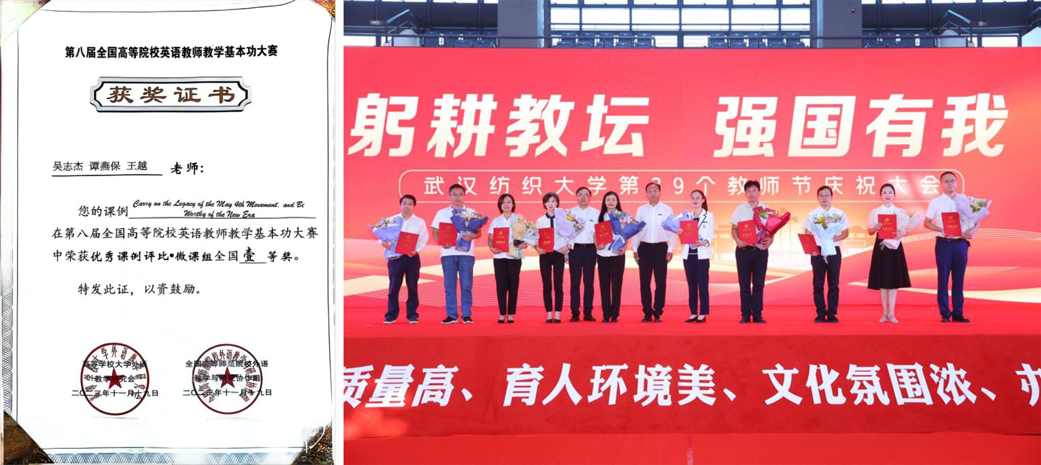 教师能力获得新提升。9月,学校印发《关于表彰武汉纺织大学2023年“最美教师”“最美纺大人”获奖人选的决定》,吴卉获评“最美教师”;10月,外语教学与研究出版社公布2023年全国高校外语课程思政教学案例大赛获奖名单,谭燕保荣获一等奖;11月,第八届全国高等院校英语教师教学基本功大赛在浙江工业大学举行,吴志杰荣获一等奖、吴凤竹荣获三等奖。
