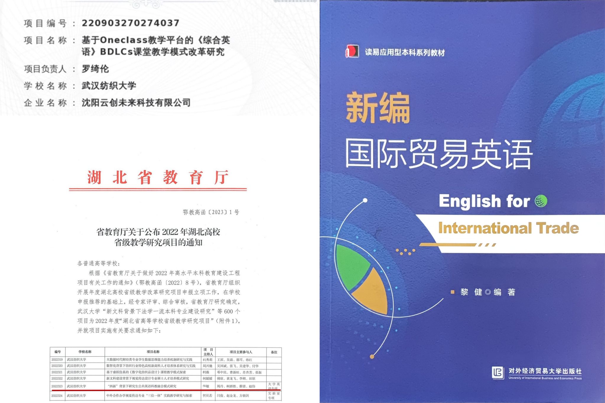 教学改革及教材建设取得新成效。2月,湖北省教育厅发布《省教育厅关于公布2022年湖北高校省级教学研究项目的通知》,华敏主持《“四新”背景下研究生公共英语科教融合模式研究》获得立项;12月,教育部发布《教育部高等教育司关于公布2023年产学合作协同育人项目立项名单的通知》,罗绮伦主持《基于Oneclass教学平台的〈综合英语〉BDLCs课堂教学模式改革研究》和刘雅婷主持《产学协同“语言、思辨、素养”三元融合的混合式大学英语优质课程建设》获批立项;12月,对外经济贸易大学出版社出版黎健主编读易应用型本科系列教材《新编国际贸易英语》。