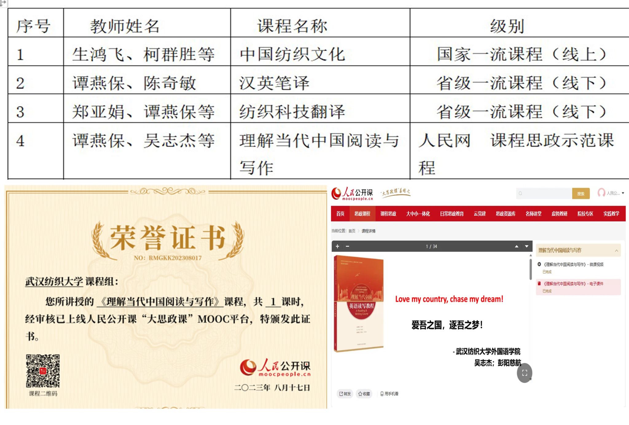 课程建设取得新进步。9月,《理解当代中国阅读与写作》课程成功上线人民网-人民公开课,荣列人民网“人民公开课大思政示范课”;11月,省教育厅印发《关于公布2023年度省级一流本科课程认定结果的通知》,郑亚娟主持《纺织科技翻译》课程获批2023年度省级线下一流课程。