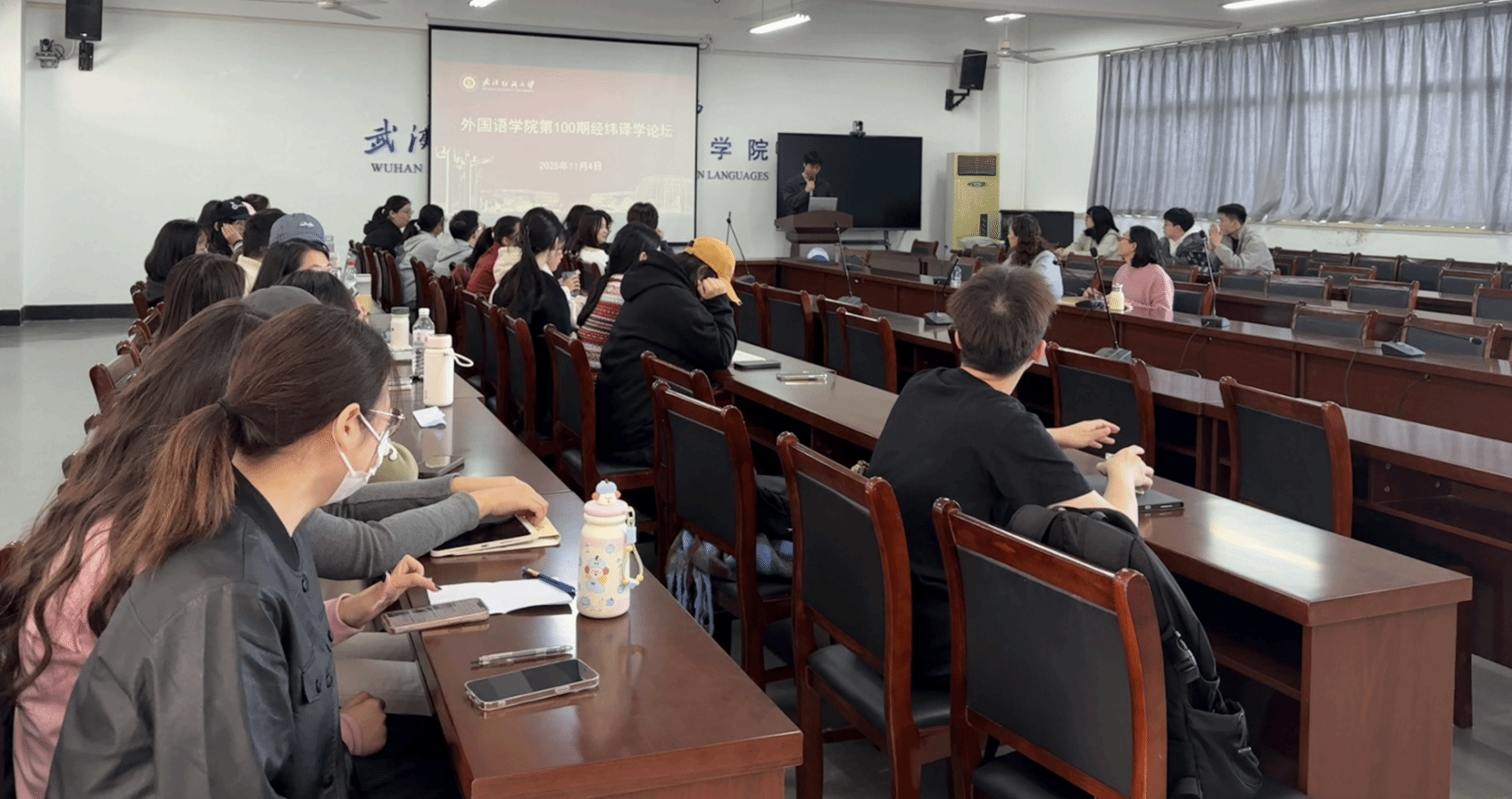 第100期“经纬译学”论坛在04-303教室成功举办。副院长刘方荣与MTI教育中心副主任陆雪芹应邀分别担任本次论坛的特邀点评嘉宾及教师主持,24级研究生金国丰担任学生主持,24级研究生卢嘉怡、邹航以及25级研究生彭雅晴、罗梦凡在论坛上进行了分享。